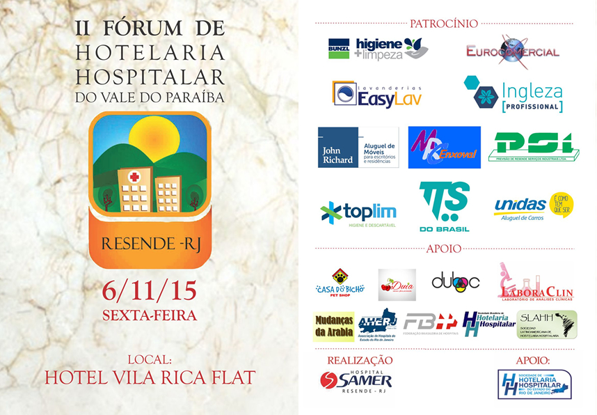 Hotelaria Hospitalar do Vale do Paraíba. Este encontro acontece nos anos ímpares, sempre no final do ano, com foco principal em Pessoas. TEMA: “Envolvimento de Pessoas atendendo Pessoas”. As inscrições serão encerradas no dia 4/11/15 – quarta-feira – 10h. |