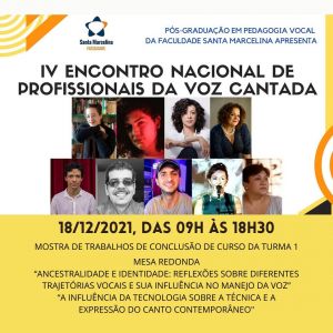 São Paulo, dezembro de 2021 – No próximo sábado, dia 18 de dezembro, ocorrerá a quarta edição do Encontro de Profissionais da Voz Cantada. O evento é promovido pela Faculdade Santa Marcelina, instituição amplamente reconhecida por sua atuação frente ao estudo acadêmico musical.