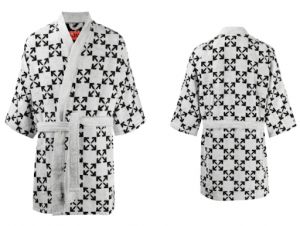 A grife italiana Off-White também aposta na linha home em seu site oficial. O roupão, que custa R$ 2.395, exibe a logo da marca em toda a extensão do tecido.