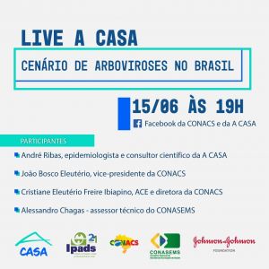 A live “Cenário de arboviroses no Brasil”- que acontece na próxima quarta-feira (15) às 19 horas no Facebook do CONACS e da A CASA- reúne os palestrantes: André Ribas (epidemiologista e consultor científico da A CASA), João Bosco Eleutérico (Vice-Presidente da CONACS), Cristiane Eleutério Freire (ACE e diretora da CONACS) e Alessandro Chagas (assessor técnico do CONASEMS) com o objetivo de compartilhar experiências e discutir medidas para controle e proteção das arboviroses urbanas.
