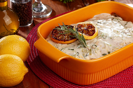 Montagem: Em uma travessa, adicione molho branco em baixo, em seguida o peixe assado e cubra com o restante do molho. Coloque fatias de limão grelhada e um ramo de alecrim.